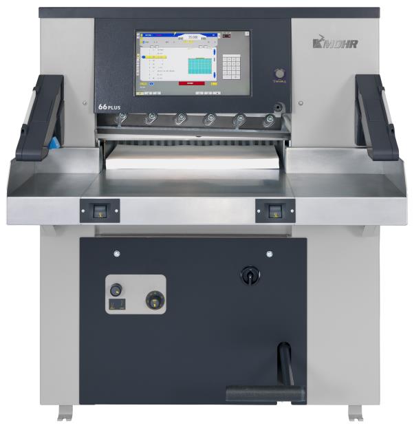 The Mohr 66 Plus guillotine brings commercial-grade automation to compact print environments, offering features that minimize errors and setup time. Its 18.5-inch touchscreen provides intuitive process visualization, allowing operators to see each step of the cutting sequence. Integrated Compucut® automation enables cutting data to transfer directly from prepress files, with optional barcode scanning to recall stored programs — reducing setup time to nearly zero.