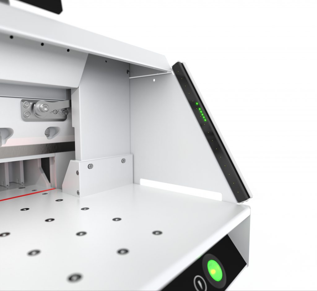 Electronically controlled IR light beam safety curtain on the front table – with status indication (red/green) in the display and the blade activation buttons ensuring safe two hand cut release).