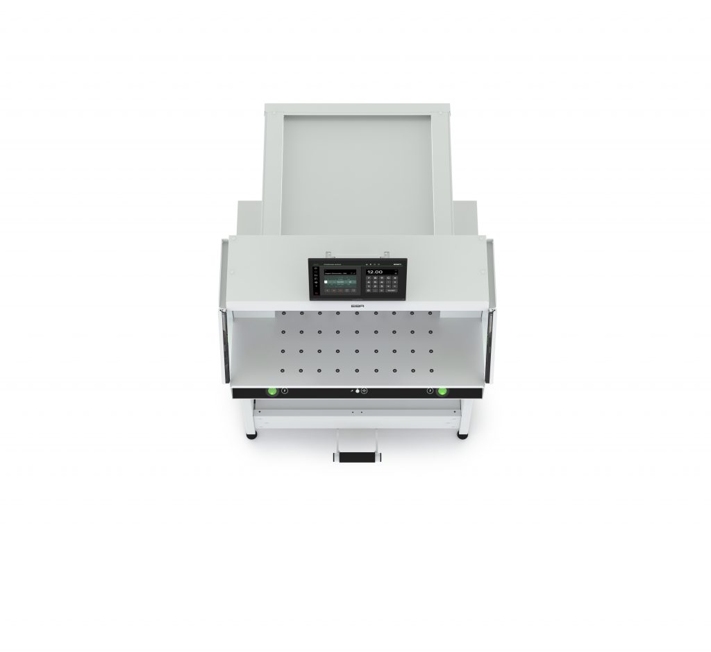 Both programmable and manual back-gauge positioning are available, with a table depth of 680mm. The adjustable back-gauge can be used with narrow separations and plastic gliders. The clamp-bar has infinitely programmable adjustment for total control of the required clamping pressure, which can be entered via the touchscreen. An electronically controlled false clamp plate, ideal for delicate work, optimises the distribution of the clamping force where required.