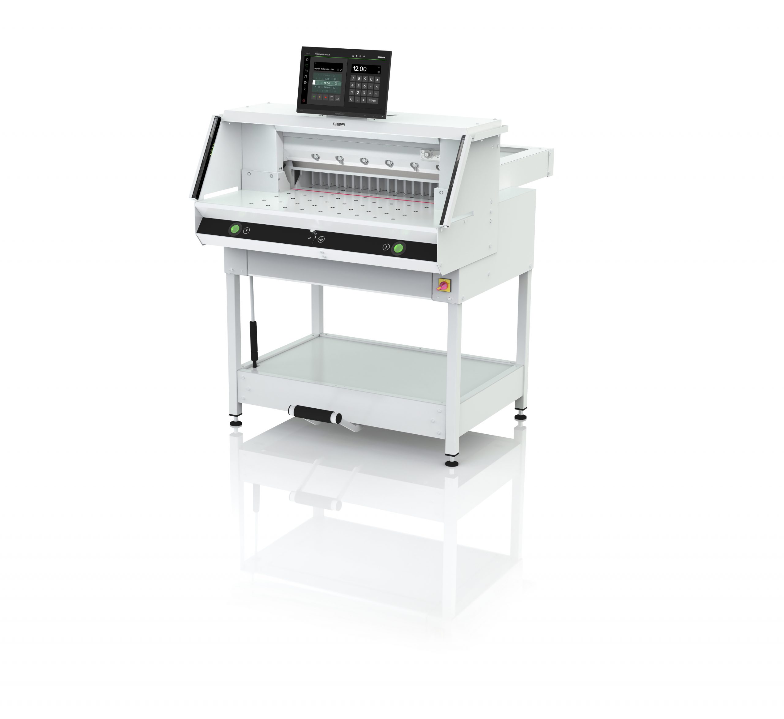 Both programmable and manual back-gauge positioning are available, with a table depth of 680mm. The adjustable back-gauge can be used with narrow separations and plastic gliders. The clamp-bar has infinitely programmable adjustment for total control of the required clamping pressure, which can be entered via the touchscreen. An electronically controlled false clamp plate, ideal for delicate work, optimises the distribution of the clamping force where required.